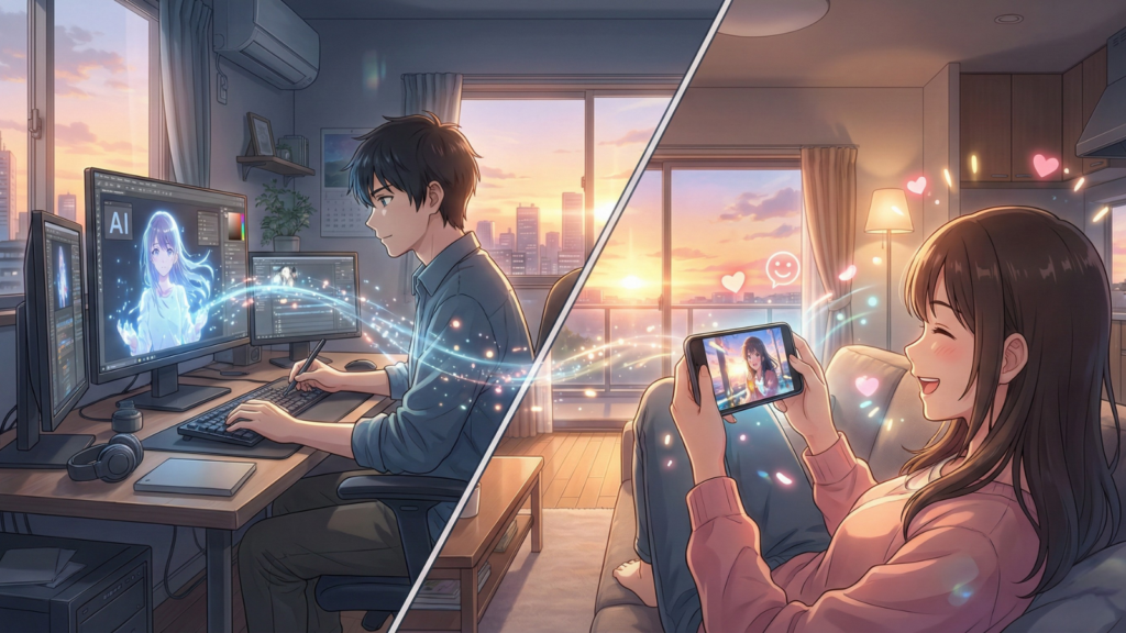 誰でも簡単にアニメが創れるAIツールを開発しています。アニメ制作の経験がなくても、企画書やプロットをAIと協働で考え、オリジナルの作品として完成させることができます。